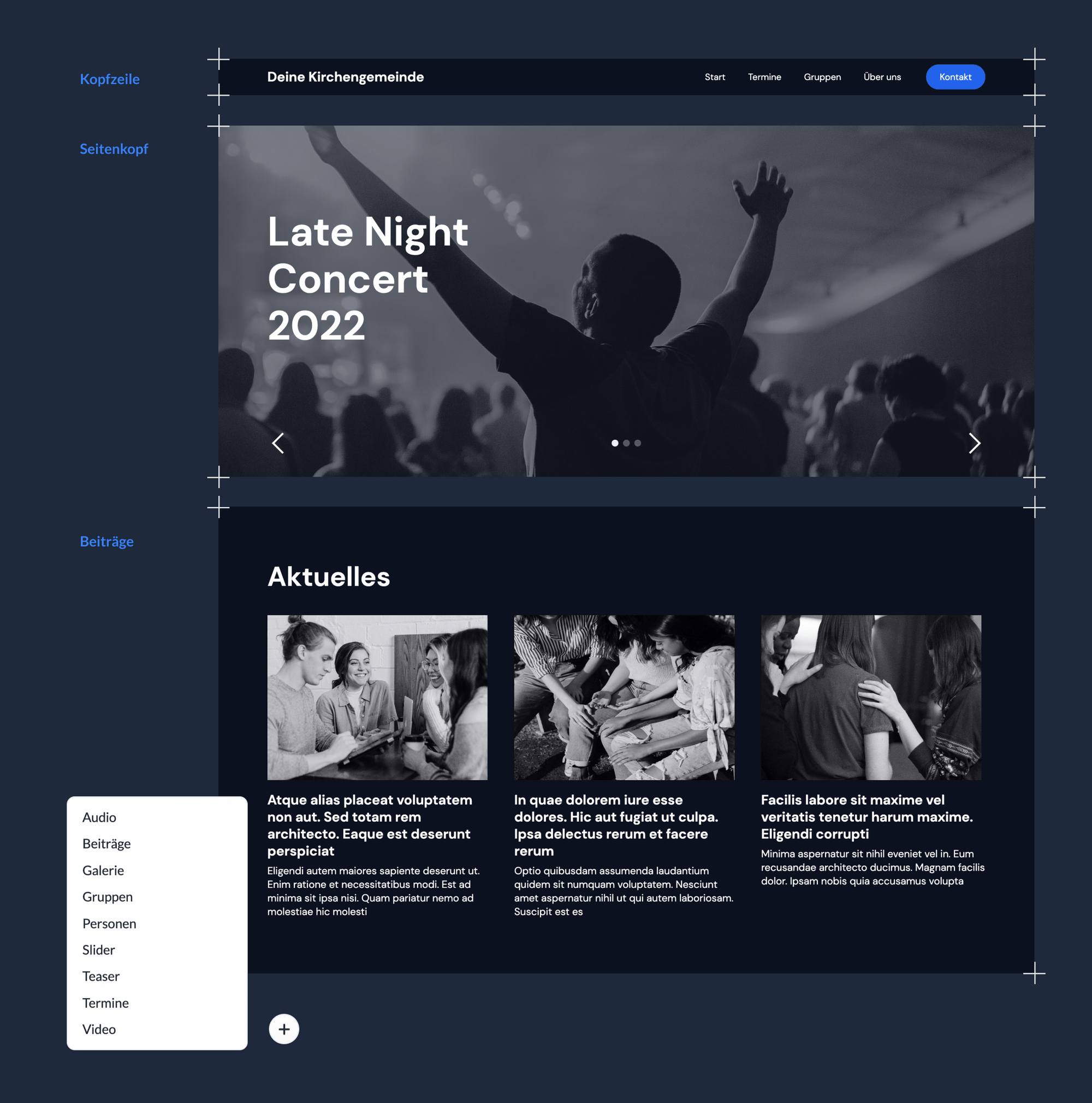 Durch das Zusammenfügen von vordefinierten Elementen entsteht in wenigen Schritten dein individueller Seitenaufbau. Ein Podcast für Predigten, Livestream für Gottesdienste oder andere kirchenspezifische Funktionen (z.B. ein Losungs-Widget) lassen sich unkompliziert einbetten oder aktivieren.