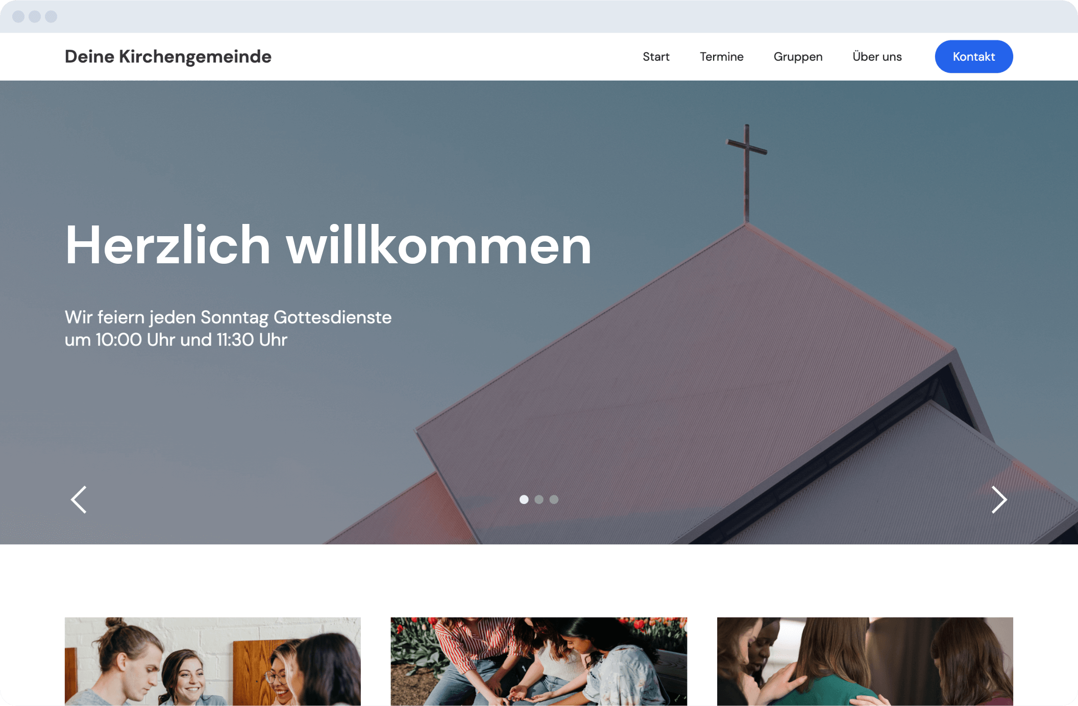 Wähle eine unserer Vorlagen aus, kombiniere sie mit einem Farbschema, das eure Kirche widerspiegelt und erstelle in wenigen Schritten eure eigene Kirchenwebsite.